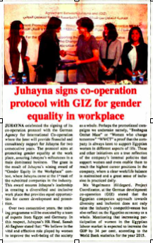 Le Caire, le 20 juillet 2016 : Juhayna a célébré la cérémonie de signature d’un protocole de coopération avec l’agence allemande de coopération internationale, qui lui fournira un support financier et des conseils pour les deux années à venir. Ce protocole vise à promouvoir l’égalité entre les sexes sur le lieu de travail, confirmant ainsi les jalons déjà posés par Juhayna dans un milieu des affaires largement dominé par les hommes. Cette subvention est le résultat de l’obtention par Juhayna du Premier Prix au concours « Egalité des Sexes sur le Lieu de Travail », lors duquel Juhayna s’est illustrée parmi les entreprises du secteur nominées. Ce prix certifie le rôle de Juhayna comme leader dans la création d’un lieu de travail diversifié et inclusif, fournissant des chances égales de promotion et de développement de carrière.